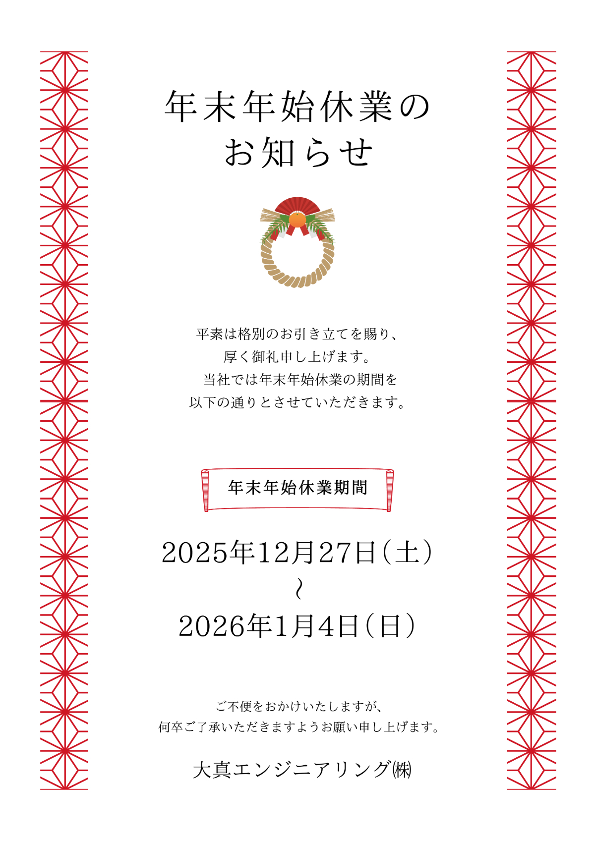 年末年始休業のお知らせ